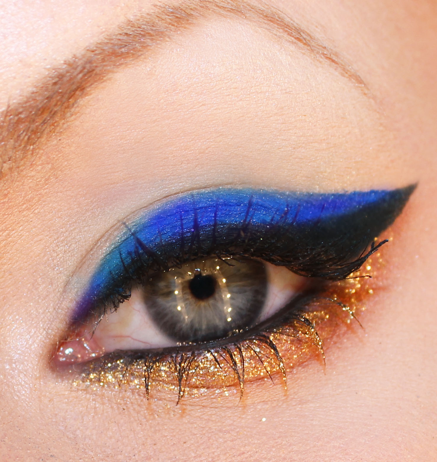Blå eyeliner + vinge längs över den svarta eyeliner, vatten blandat med lösögonskuggan Make Up Store Eyedust (Sight)