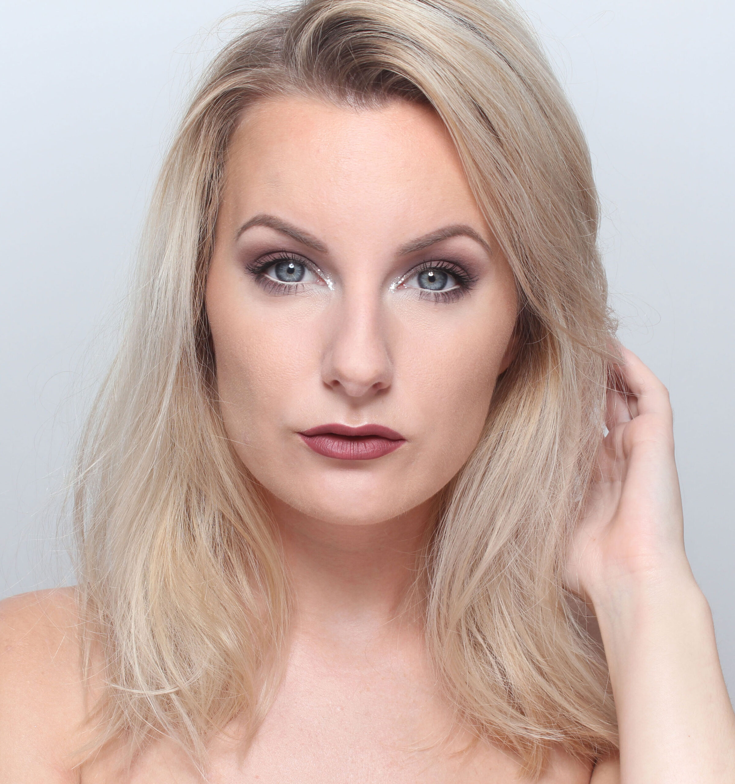 Lägg mer gråbrun skugga innerst på ögonlocket samt i uttoningen - Silverglitter i ögonvrån, fäst med Kryolan Cake Liner Sealer