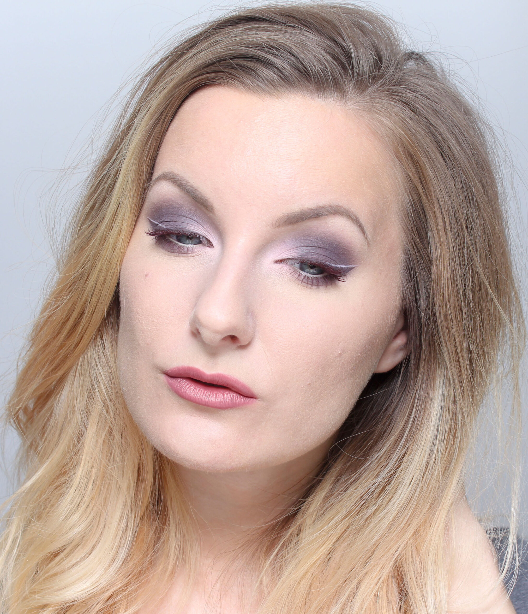 - Blanda den lila och den rosa ögonskuggan med Kryolan Cake liner sealer och gör en eyeliner med vinge med den lila skuggan och en ljus linje över vingen med den ljusrosa skuggan.