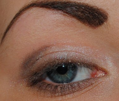 Then put a white shimmery eye shadow in the corner of the eye and along the lash line on the brown, Isadora 35 Pearls.