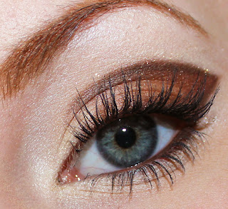 Golden brown eye shadow in the middle of the eyelid, Glo Minerals Eyeshadow trio Copper Sheen.