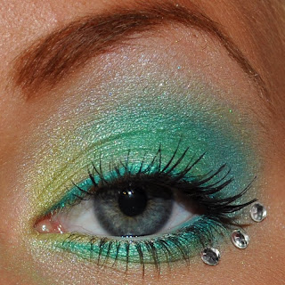 Green eye shadow next to the turquoise green on the eyelid and on the lower lash line.