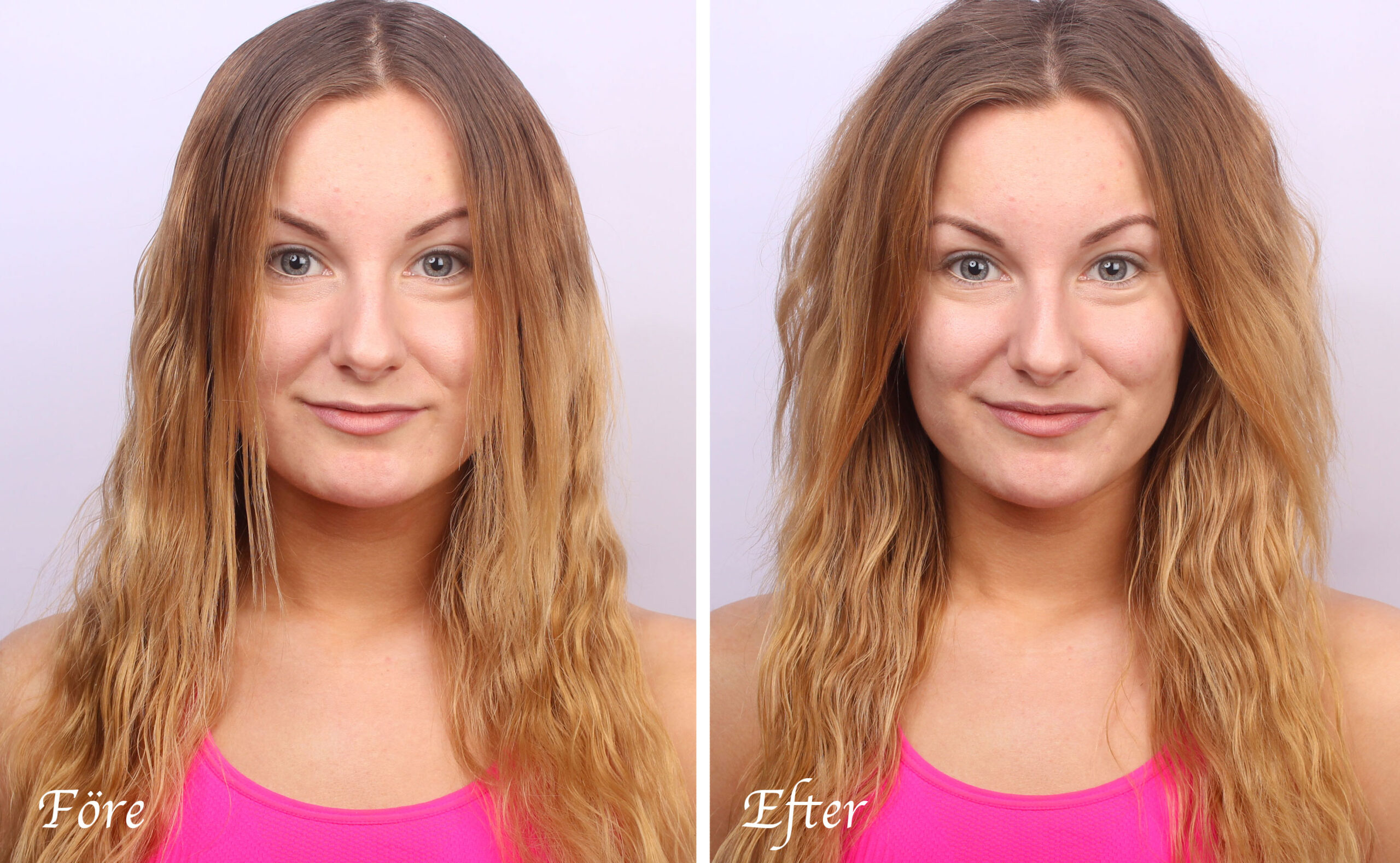 Aquí obtienes una imagen más "seria" de antes y después, ¡una gran diferencia! Pensé en echar un vistazo más de cerca al cuero cabelludo del modelo, pero se veía tan asqueroso que no quería jaja. Era incluso más aceitoso de lo que parece en la imagen :)