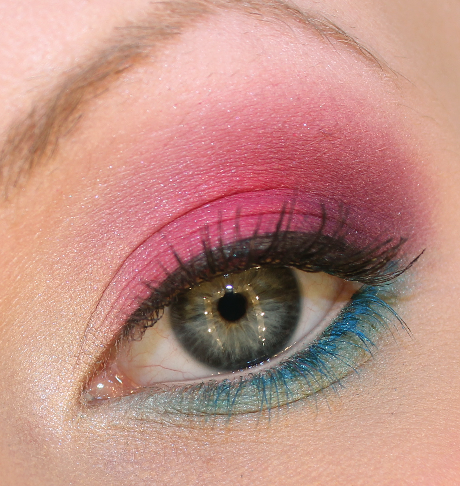 Sombra de ojos azul solo en el cuero cabelludo de las pestañas a lo largo de la línea inferior de las pestañas. (Humedeció el cepillo y untó un poco las pestañas también)