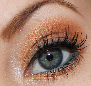 Un maquillaje dorado y marrón con un pequeño color turquesa haga clic en la línea interior de las pestañas.