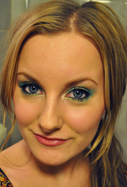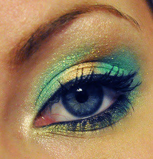 La sombra de ojos verde se ve verde caqui en la parte inferior de la línea de las pestañas inferiores en la imagen. Eso es porque puse la sombra de ojos dorada allí primero, pero me arrepentí y puse la verde.