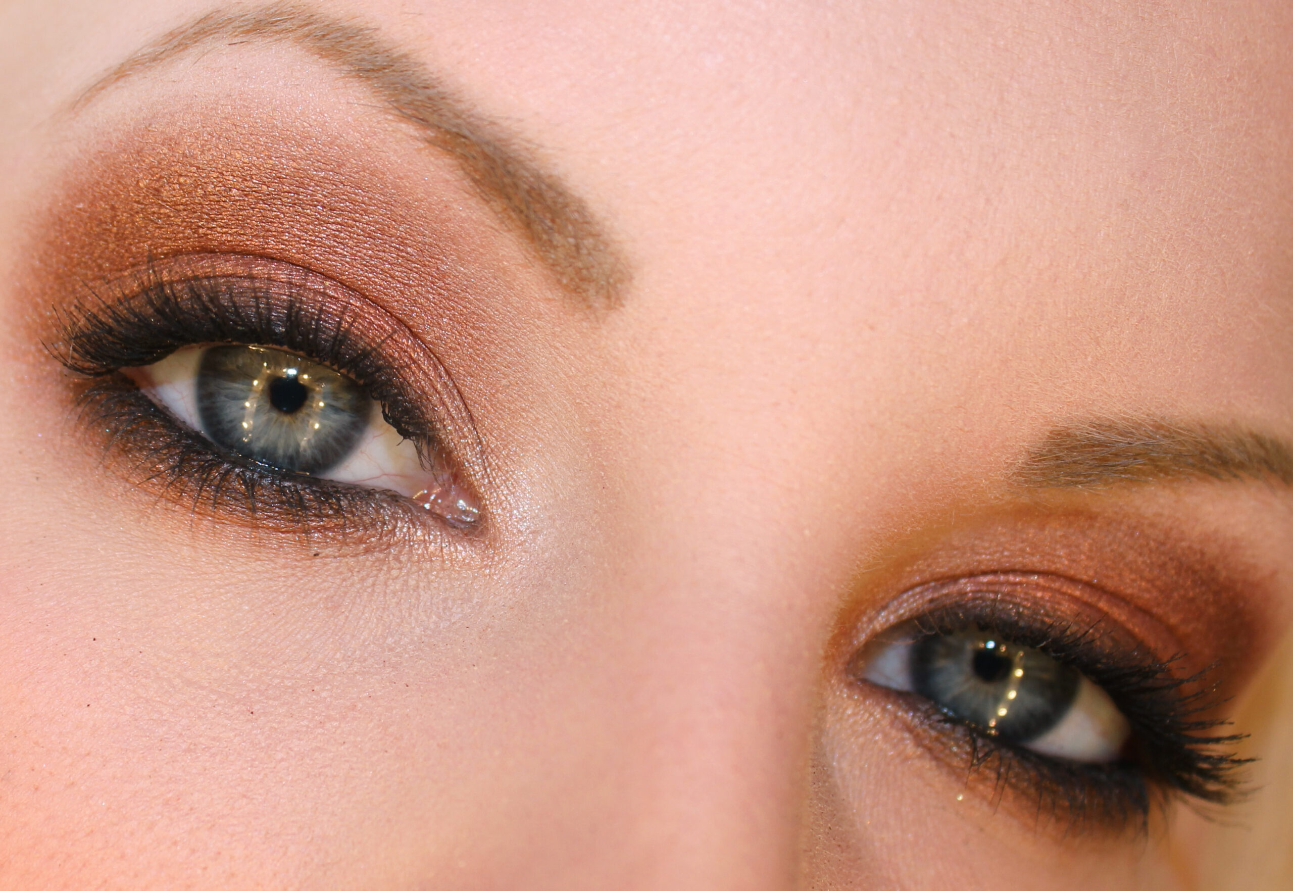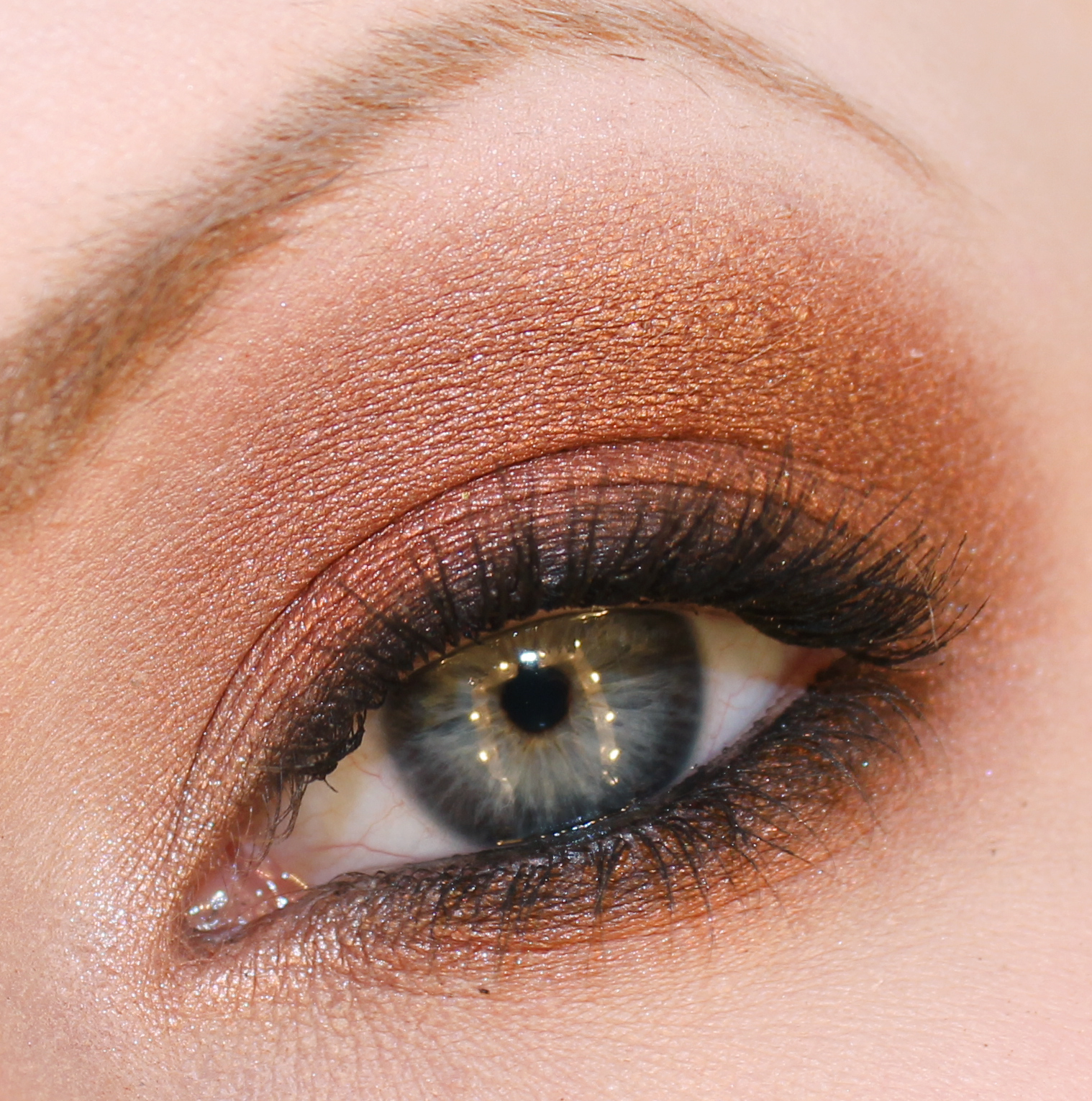 Sombra de ojos marrón cobre a lo largo de la línea de las pestañas inferiores y todo el párpado.