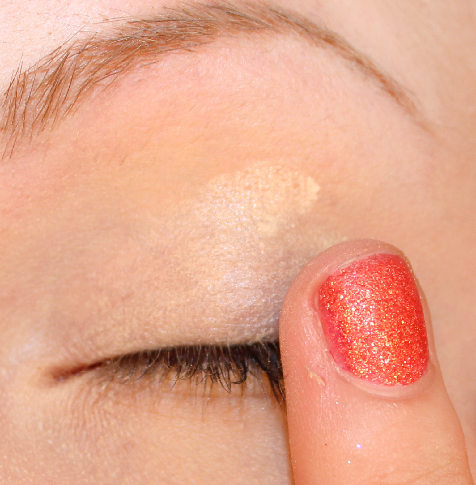 Aplique una capa lo más fina posible, pero no sea tan tacaño que se pierda algún lugar porque entonces la sombra de ojos puede mancharse.