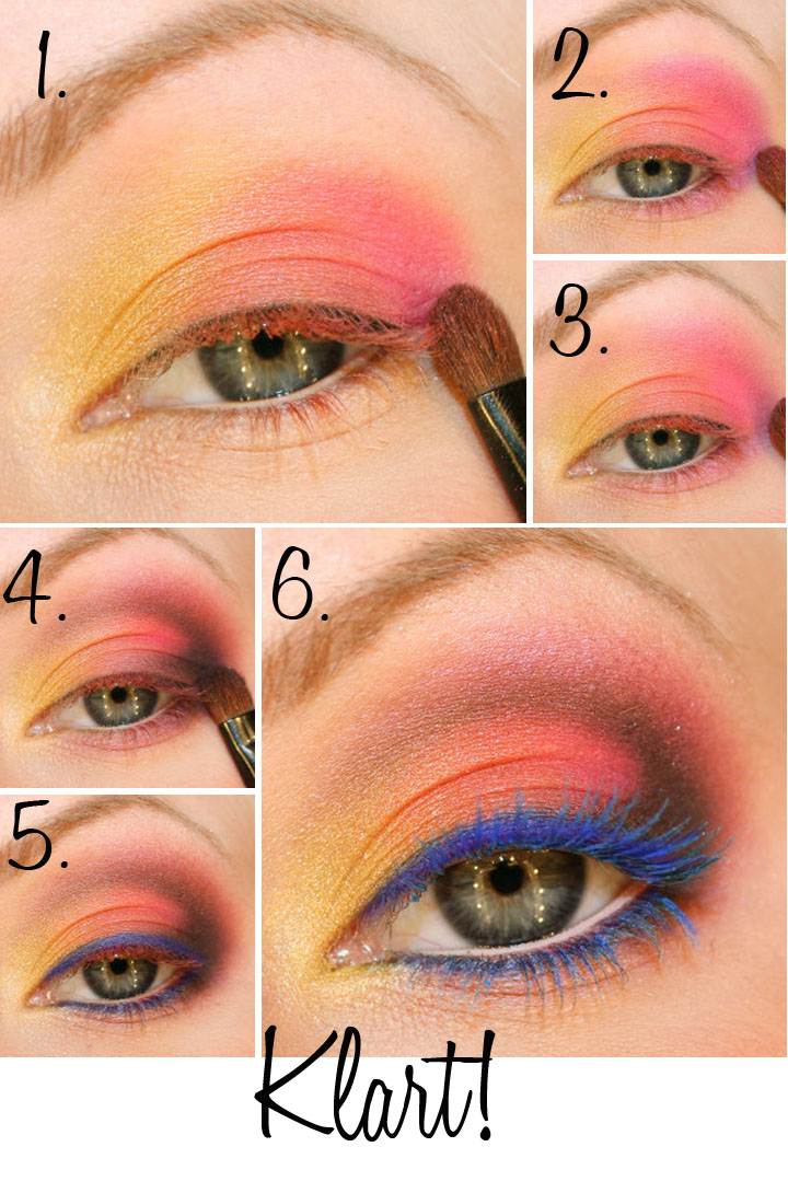 1. Lay amarillo, naranja y rosado sombra de ojos una al lado de la otra en el párpado.