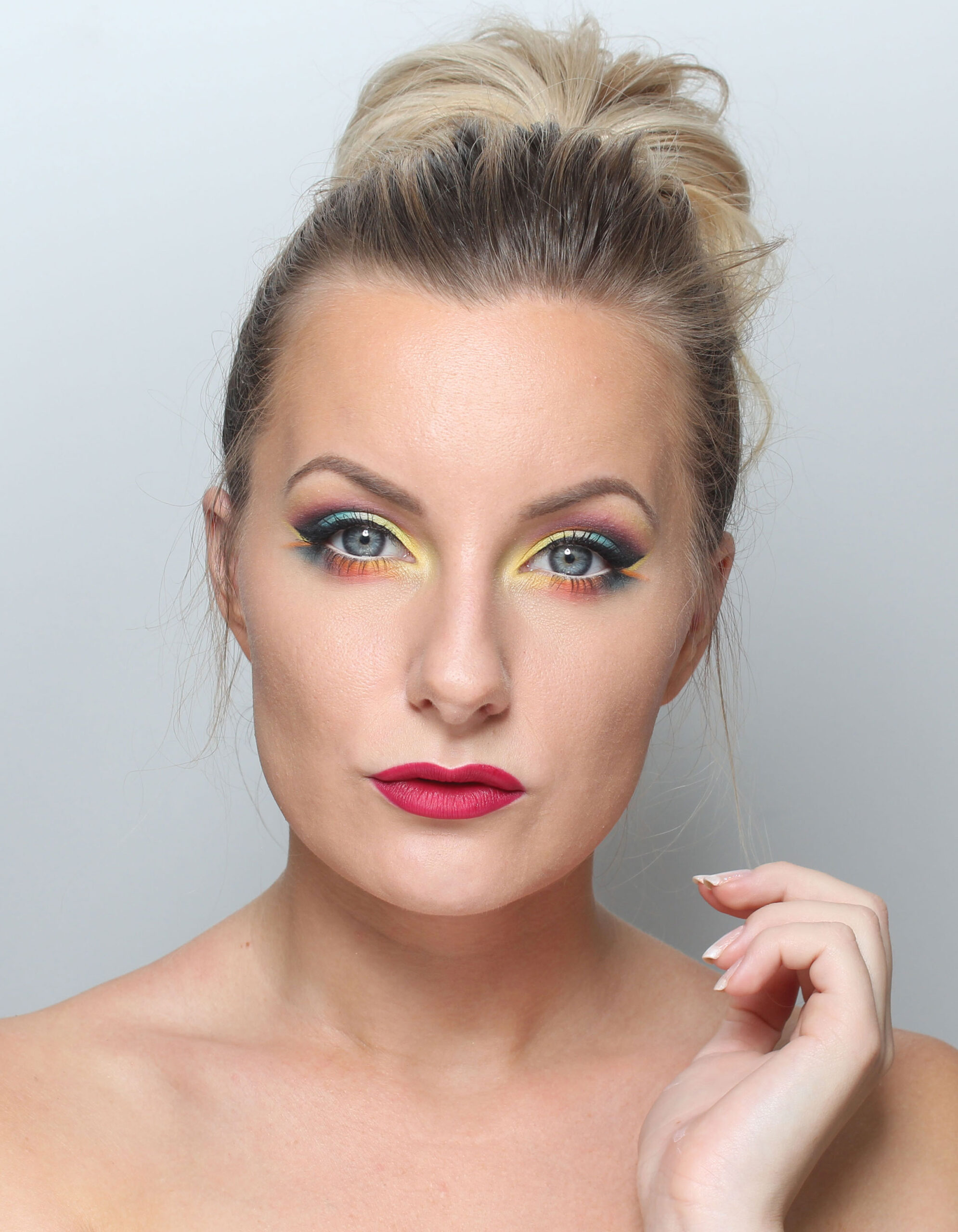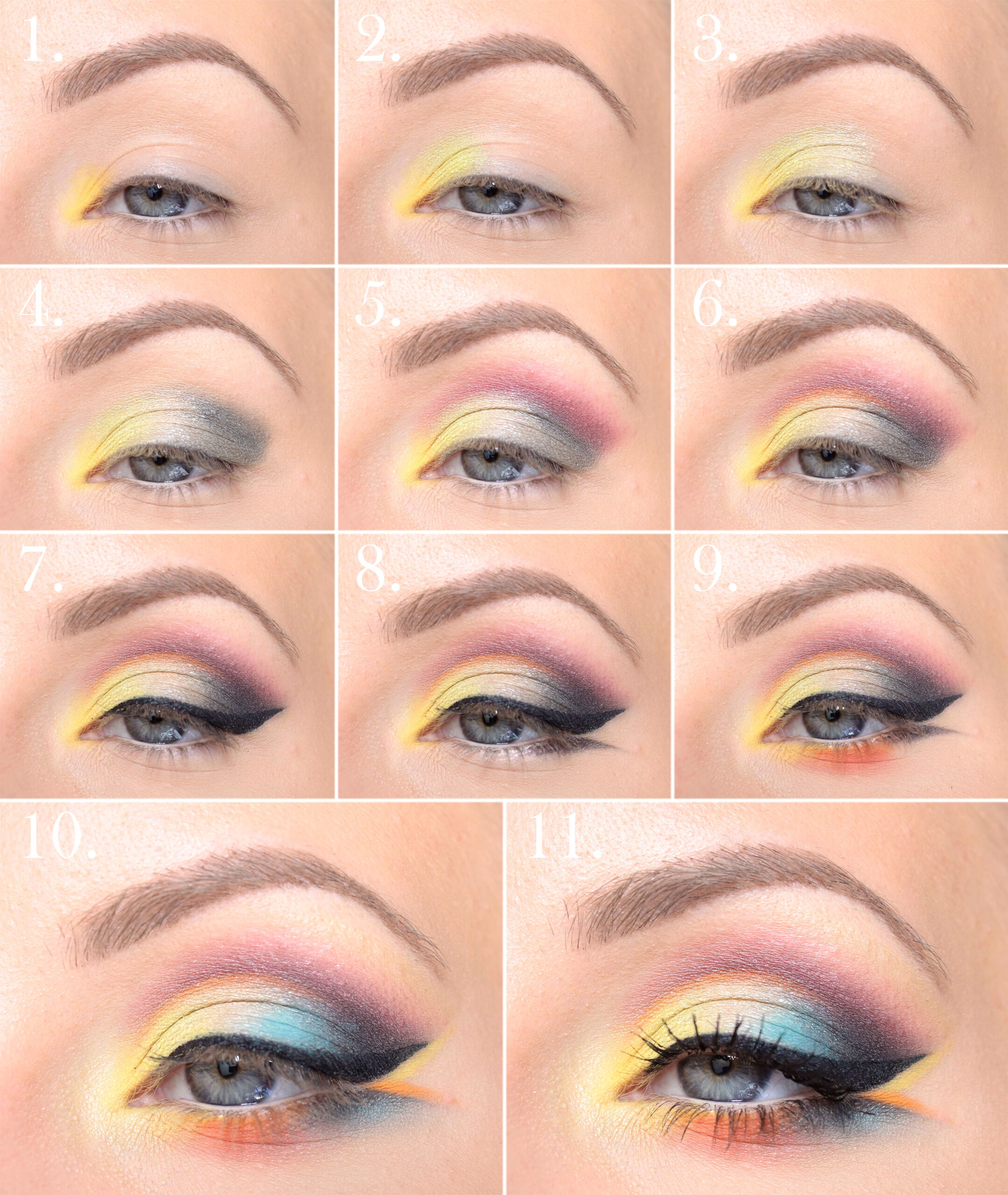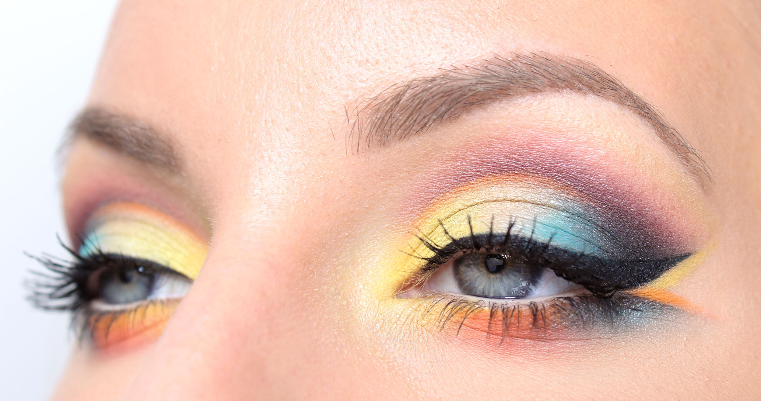 - Gul, orange och röd ögonskugga i mitten av undre fransraden