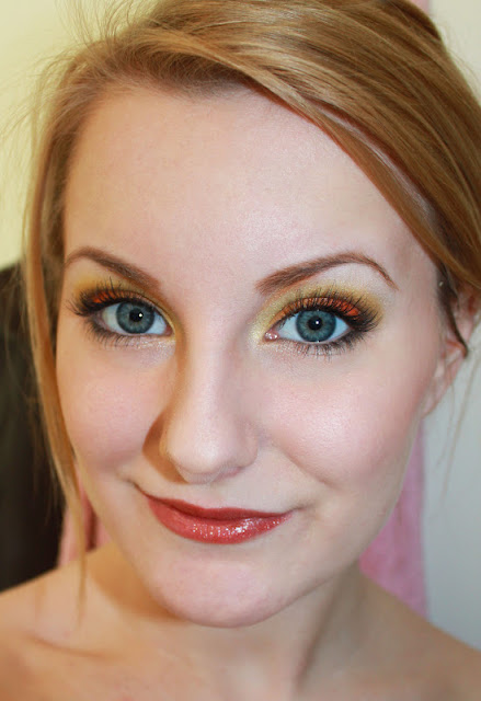 Mörkgrå ögonskugga ytterst på undre fransraden och längs globlinjen (blir en brun ton längs globlinjen tack vare den gula skuggan)