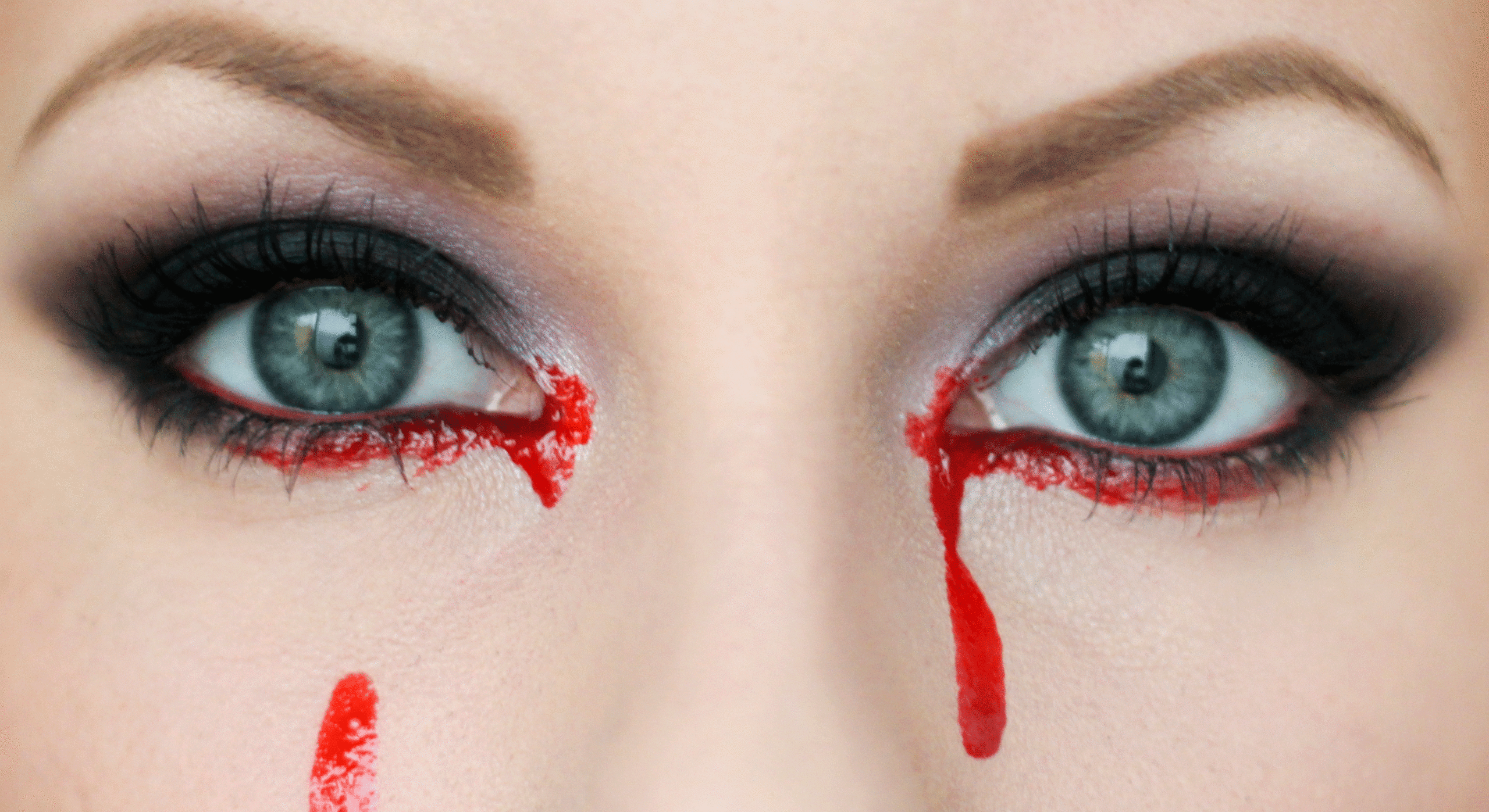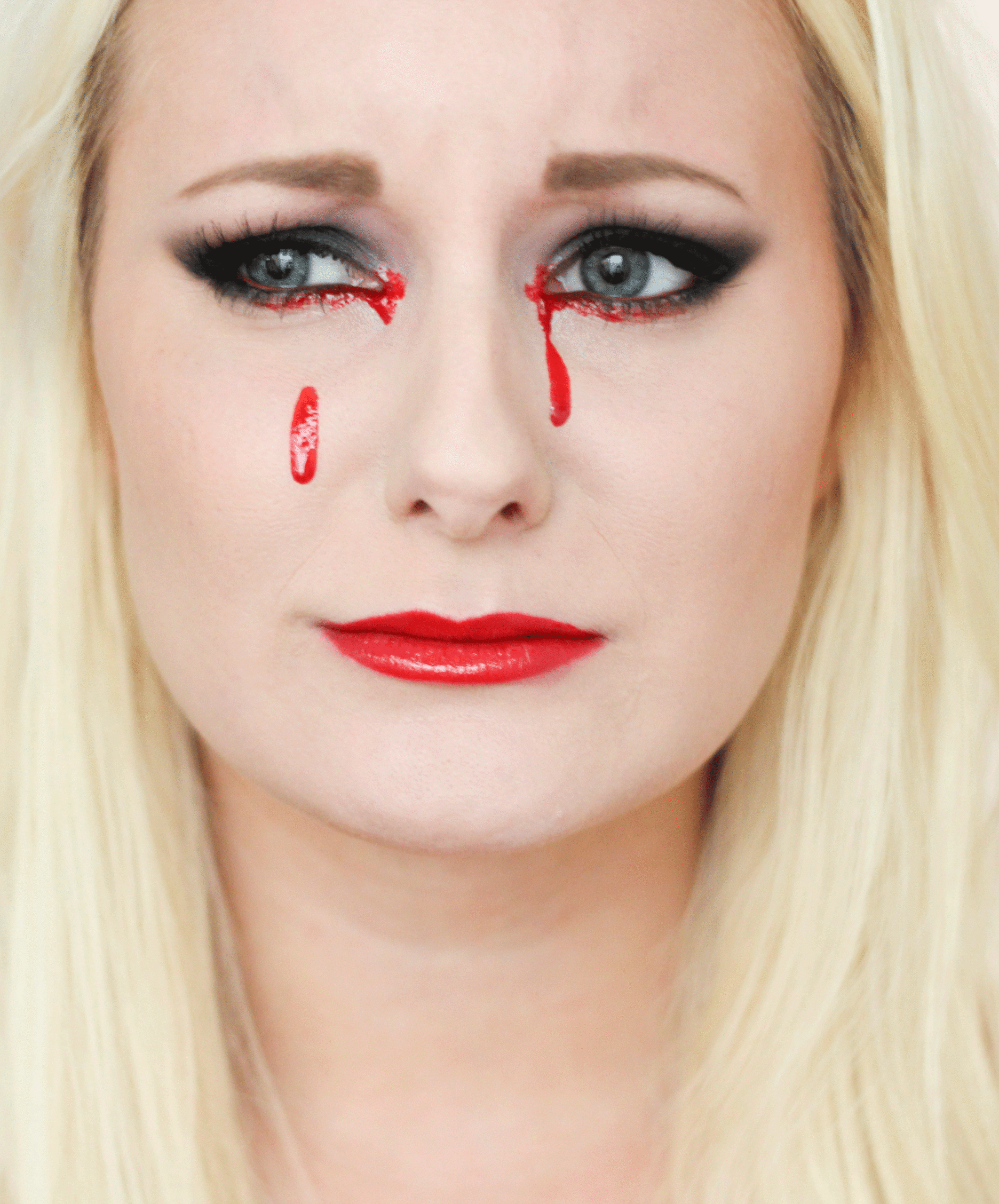 Att leka med ögonen tycker jag är roligt! Applicera en röd läppenna längs vattenlinjen, och lägg fejkblod längs fransraden, i ögonvrån eller till och med ner på kinderna som om du gråter blod.