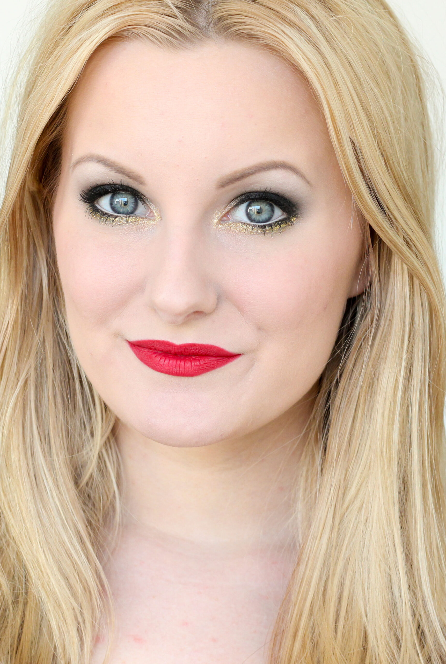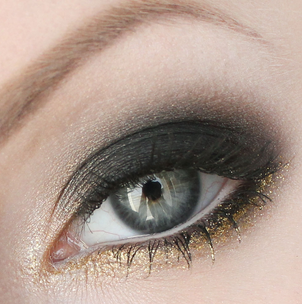 Guldglittrig eyeliner längs undre fransraden och ögonvrån, True Gold Glitter Eyeliner (tror inte den finns att köpa längre tyvärr)