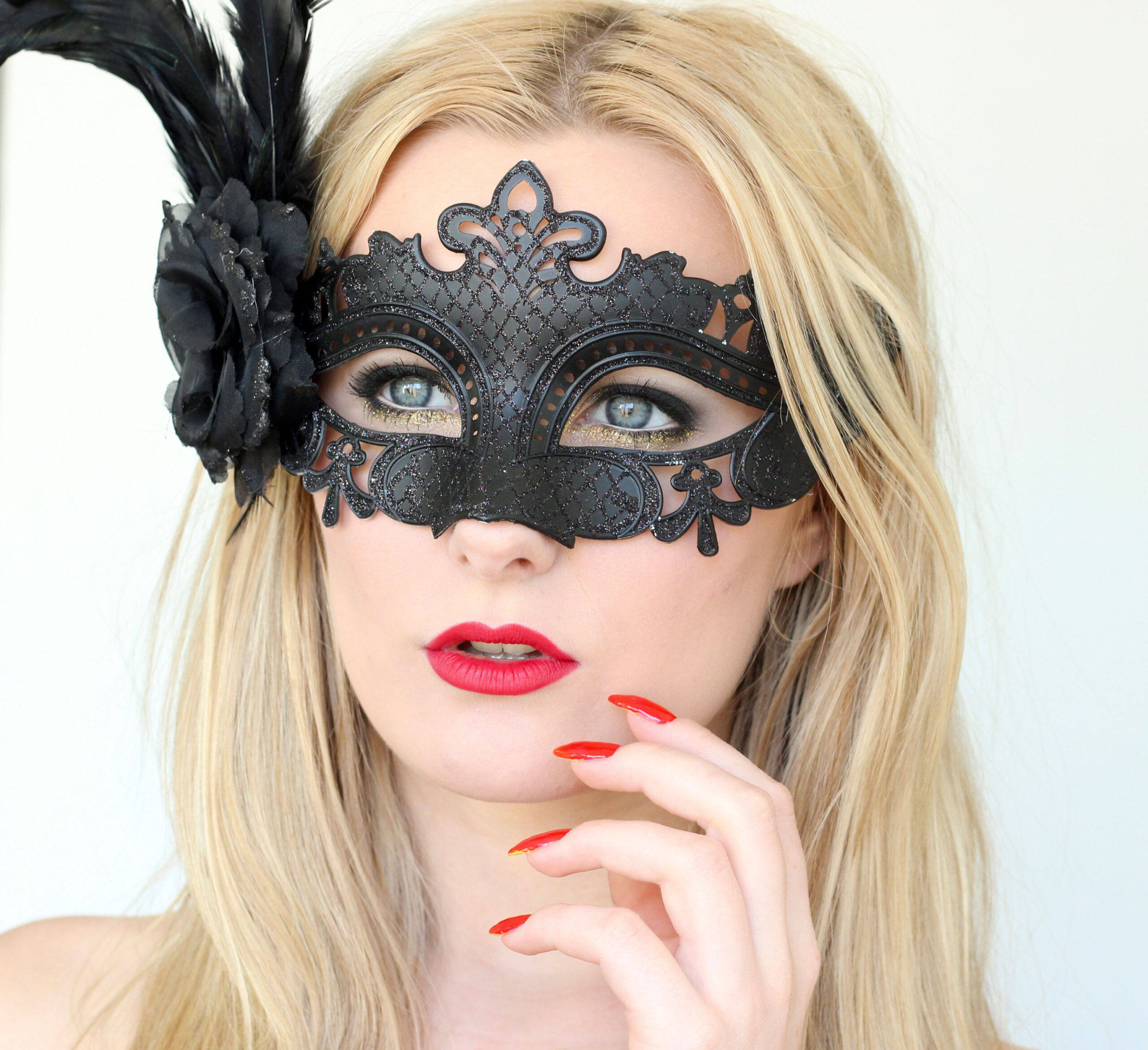 Min mask har mycket luft under ögonen, men inte jättemycket ovanför. Därför har jag en sotning på ögonlocket som inte går upp långt mot ögonbrynet alls, eftersom jag fortfarande vill ha ett mellanrum mellan masken och sotningen. Den mellanrummet har jag även highlightat med skimrig skugga. Sedan smackade jag på med mycket glitter under ögat istället, där man har chansen att synas lite mer :)
