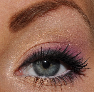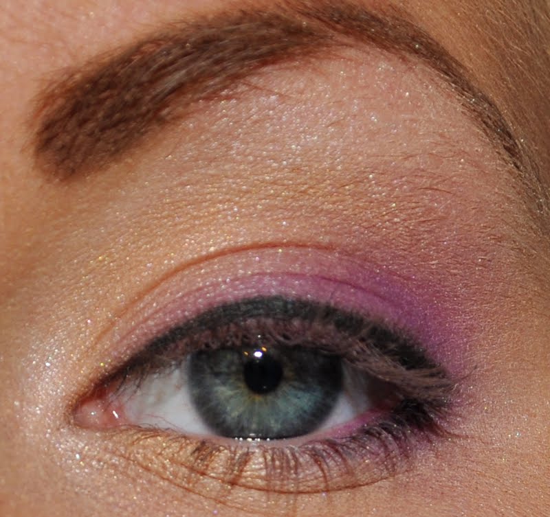Lila ögonskugga ytterst på ögonlocket och längst ner en bit in, 180 paletten.