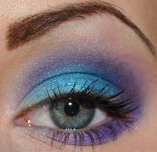 Vit highlighter under ögonbrynet, i ögonvrån och lite upp på den blåa ögonskuggan.