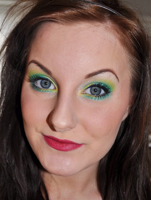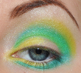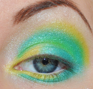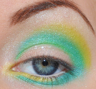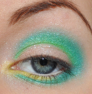 Att jag inte har mött den gula ögonskuggan med den turkosblåa genom att sudda ihop dom, utan lagt dom omlott! En mycket bättre idé när man använder en ljus längst in och en mörkare ytterst. Det är snyggare och gör att ögat ser större ut!