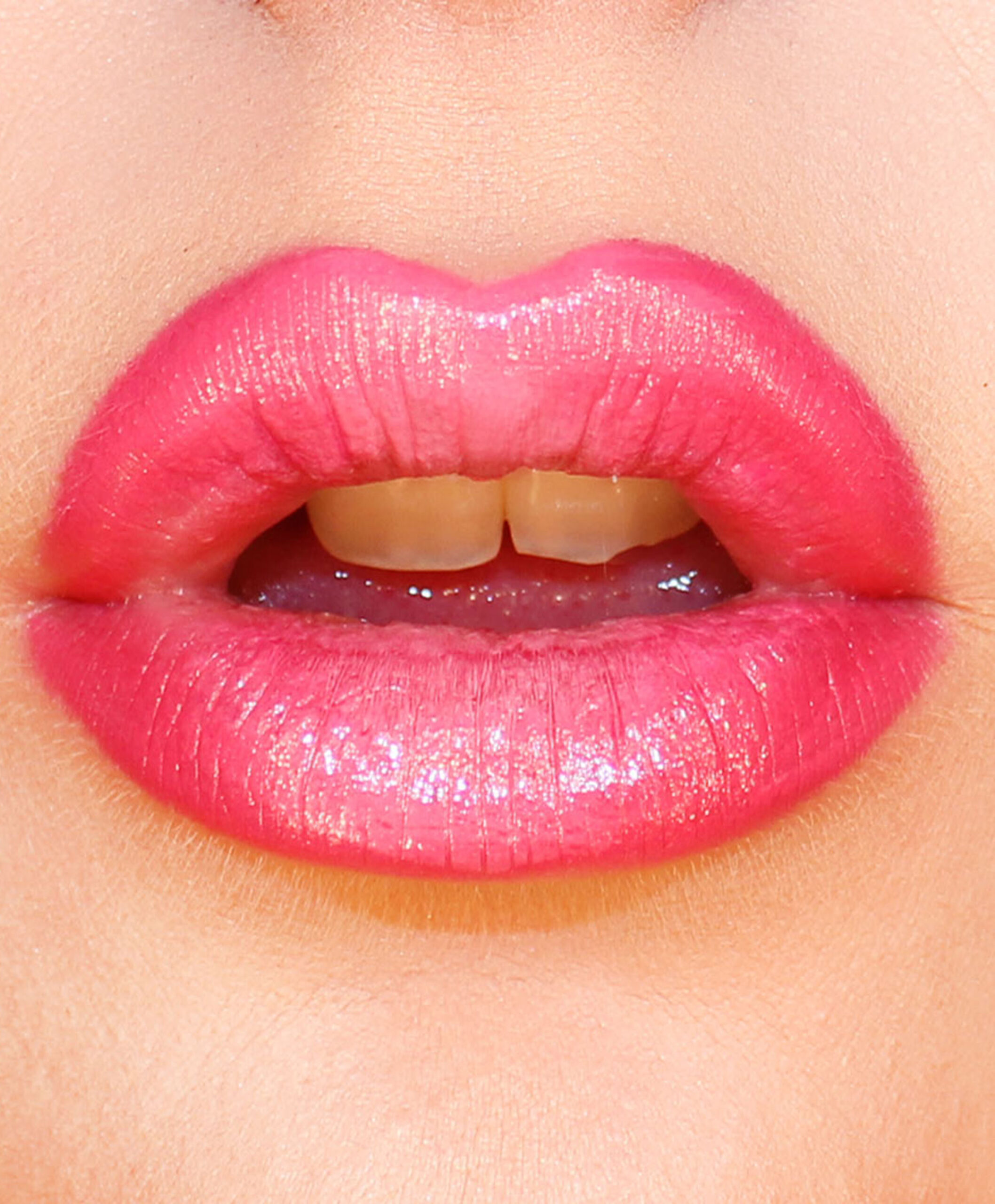Skimrigt läppstift precis i mitten av läpparna.