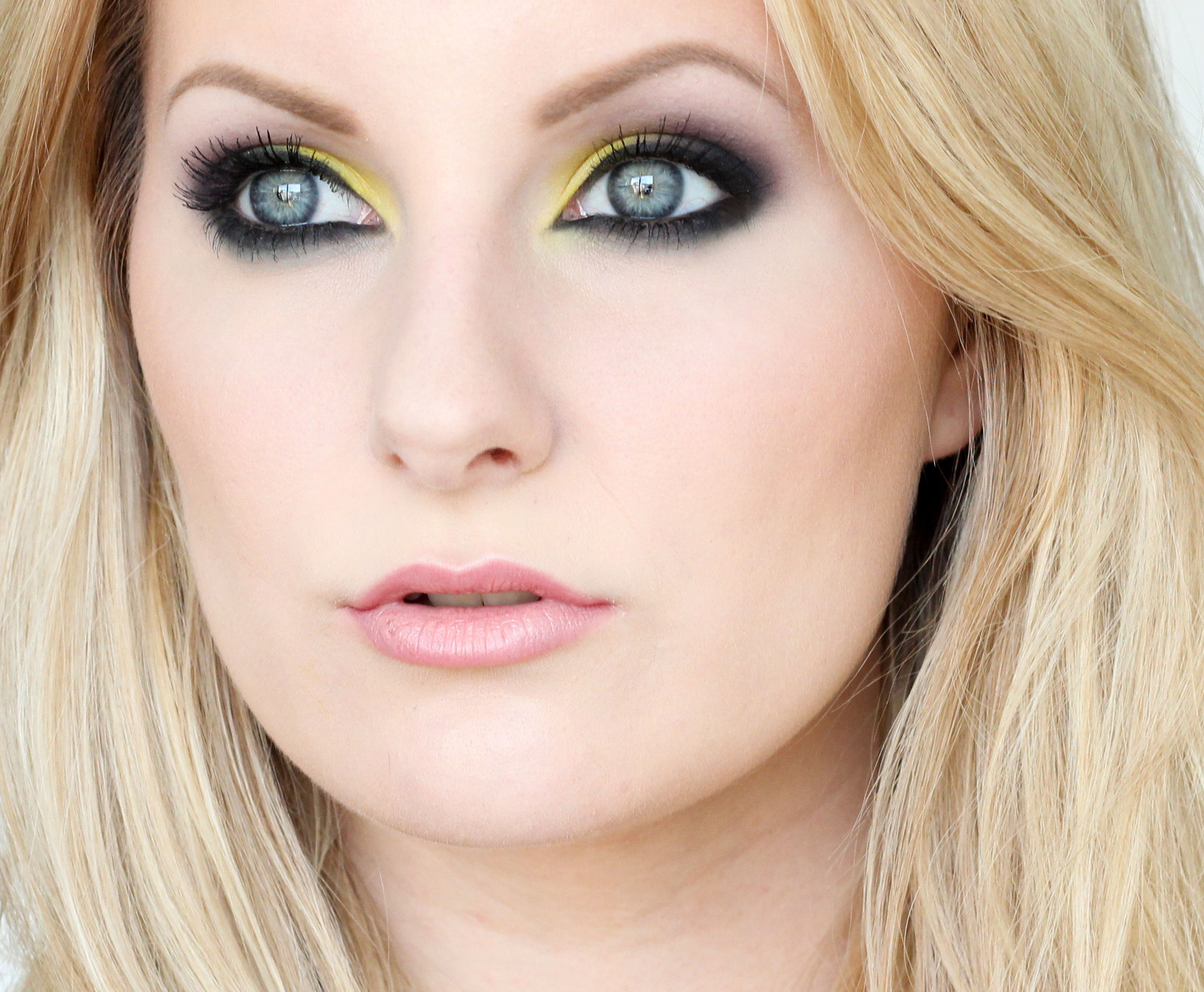 Här kommer därför en mörk, sotad partysminkning – med en gul färgklick innerst på ögonlocket som bryter av och livar upp :)
