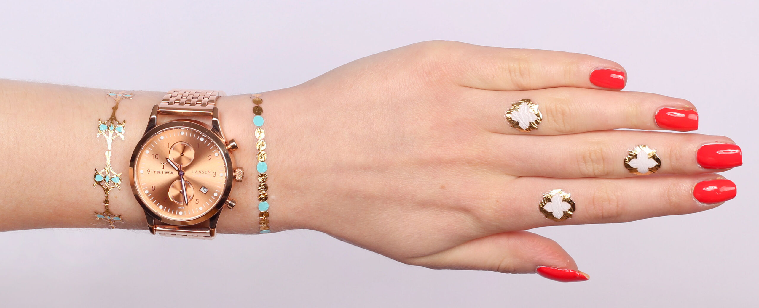 Jag har hittat min stil inför sommaren i alla fall – Inget smyckar armarna så fint (och enkelt) som guldtatueringar, snyggt målade naglar och en fin klocka!